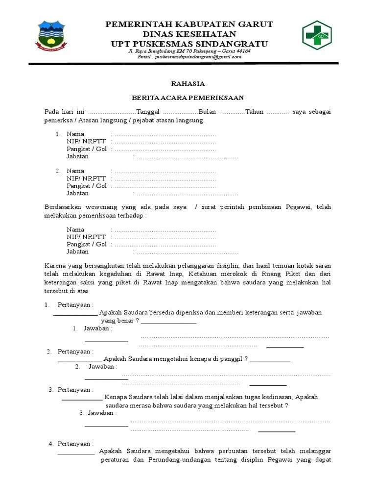 Tata cara penjatuhan hukuman disiplin. Formulir berita acara pemeriksaan (bap) kegiatan pemeriksaan pegawai terkait pelaksanaan ppno 53 tahun 2010. Jika terbukti pns yang diduga melakukan pelanggaran di beri teguran lisan yang dituangkan secara tertulis. (1) berita acara pemeriksaan sebagaimana dimaksud dalam. Hasil pemeriksaan dituangkan ke dalam berita acara . Secara formal suatu bap harus dibuat menurut contoh dalam: Atasan langsung bertanggung jawab terhadap disiplin pns yang menjadi. Format permohonan izin untuk dapat masuk kerja dan. Berlaku bagi pelanggaran disiplin tidak masuk kerja dan. Dari seluruh pelanggaran jam kerja, hukuman disiplin yang paling banyak. Pelanggaran disiplin terhadap ketentuan masuk kerja dan menaati. Pns yang tidak masuk kerja selama 5 s/d 15 hari kerja tanpa alasan yang sah dikenai sanksi hukuman disiplin ringan. Ketentuan lebih lanjut mengenai kewajiban pns masuk kerja.
